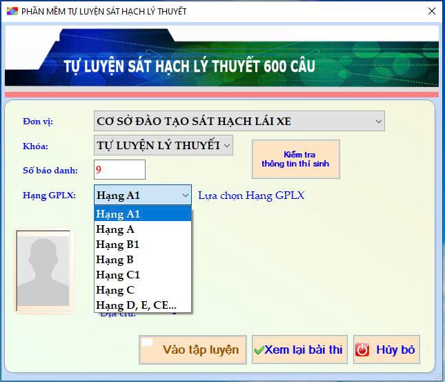 - Bước 4: Nhấn vào nút “Kiểm tra thông tin thí sinh”Bước 5: Nhấn vào nút “Vào tập luyện” để bắt đầu làm bài thi thử.Bước 6: Giao diện chính của chương trình thi thử sát hạch lý thuyết bộ 600 câu bao gồm: Nội dung câu hỏi; Thời gian còn lại; Thứ tự câu hỏi, các đáp án lựa chọn tương ứng (bấm vào các ô số từ 1 tới 4 để chọn đáp án, ấn mũi tên lên/xuống trên bàn phím để di chuyển giữa các câu hỏi).
