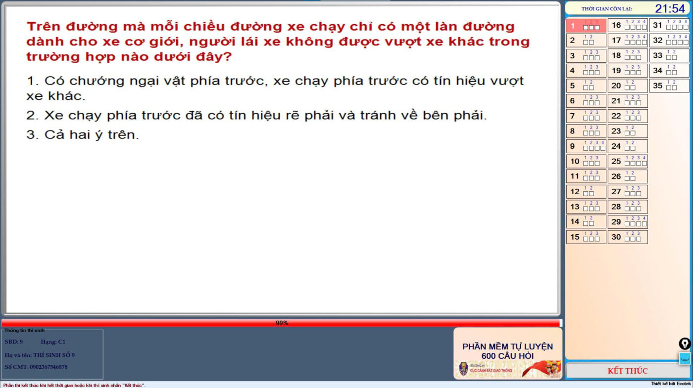 - Bước 7: Chọn nút “Kết thúc” để hoàn tất phiên thi thử. Phần mềm sẽ hiển thị kết quả thi thử của bạn.